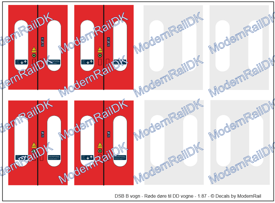 1 sæt til 1 vogn (4 døre) – Decalsæt med røde døre inkl. ikoner til DSB Dobbeltdækkervogne – H0