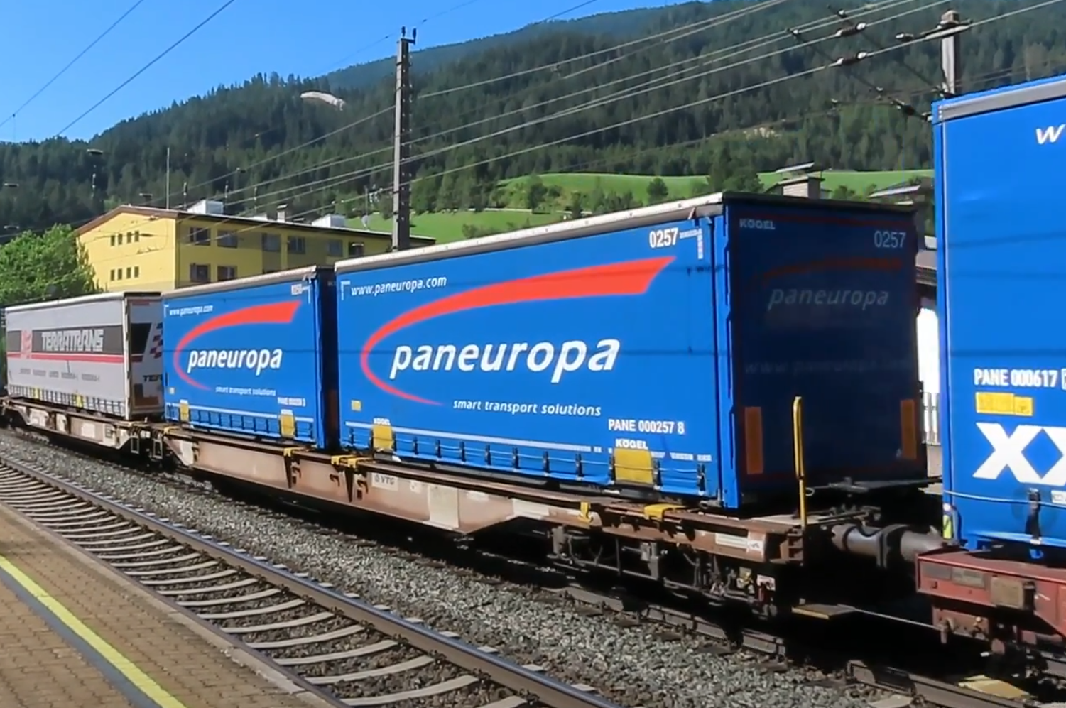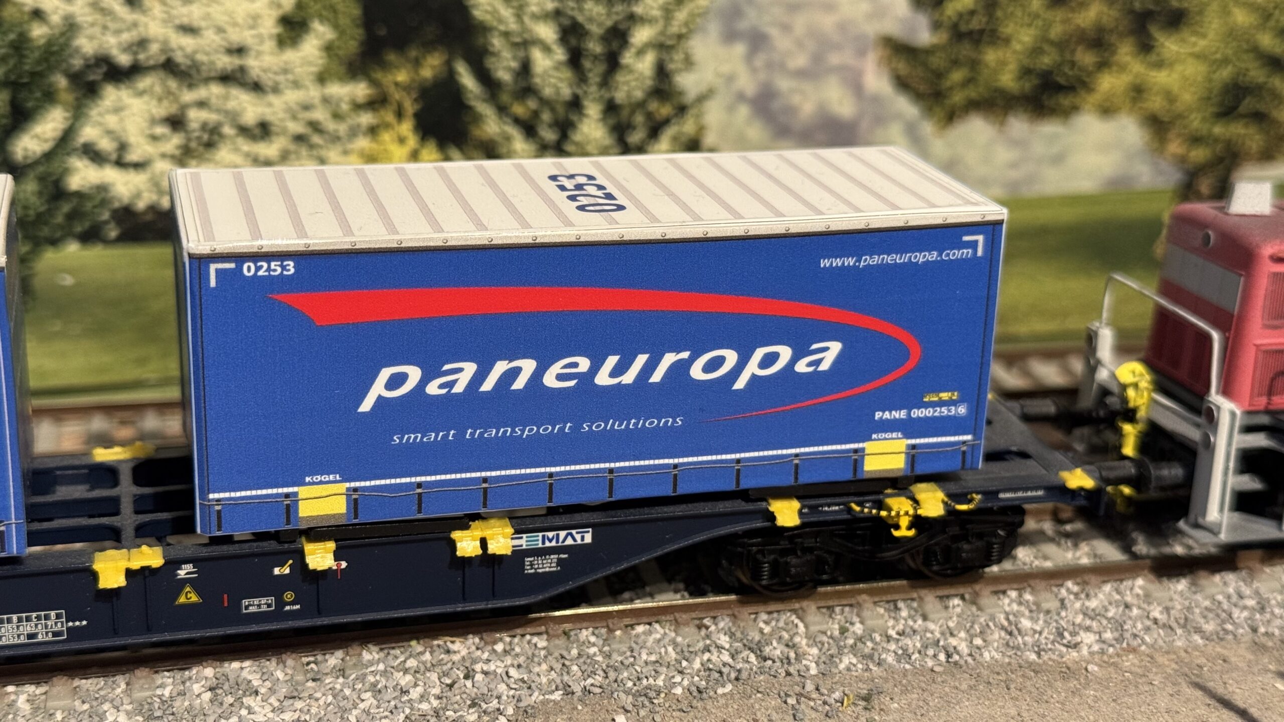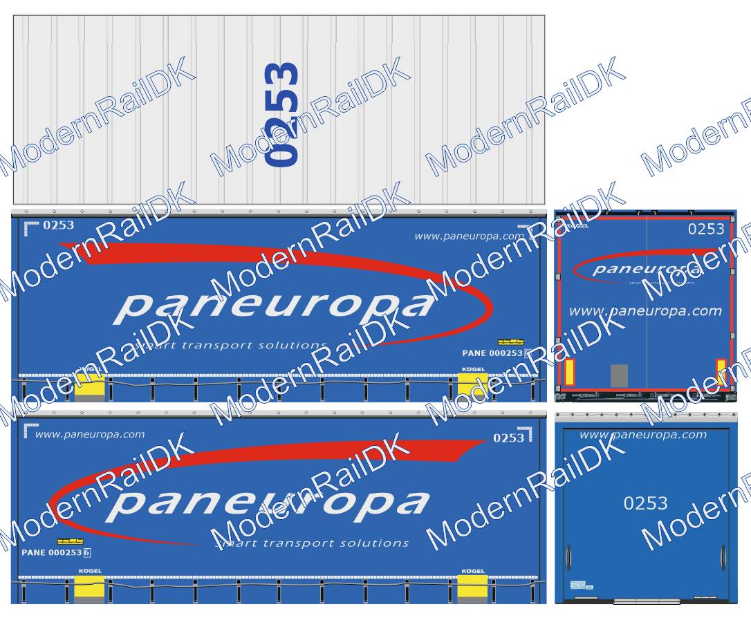 1 Stück Decalsatz für eine Herpa Wechelbrücke – Paneuropa, Box, Kögel, 7,45 m Low, Wechselbrücke Dunkel Blau H0